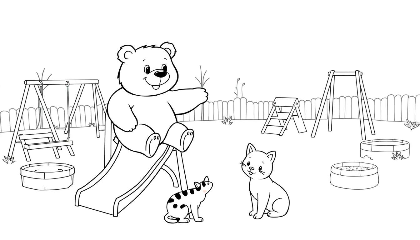 Deze hartverwarmende zwart-witte lijntekening nodigt kinderen uit om hun creativiteit de vrije loop te laten. Centraal staat een grote, lachende beer die op de glijbaan zit en vriendelijk zwaait. Voor hem, op de grond, zitten twee schattige katten: een gevlekt exemplaar dat omhoog kijkt en een witte kat die rechtop zit en de beer aankijkt met een glimlach. De tekening zit vol leuke details die een levendige speeltuin creëren. Links van de beer zien we een schommelrek met een bankje, en een ronde zandbak. Rechtsachter de beer is een kleine klimladder te ontdekken, en verderop nog een schommelrek zonder schommels, met daarnaast twee lage, ronde bakken die dienen als zandbakken of ondiepe badjes. Een houten paaltjeshek omkadert de speeltuin, terwijl kleine bosjes gras en plantjes de buitenomgeving compleet maken.