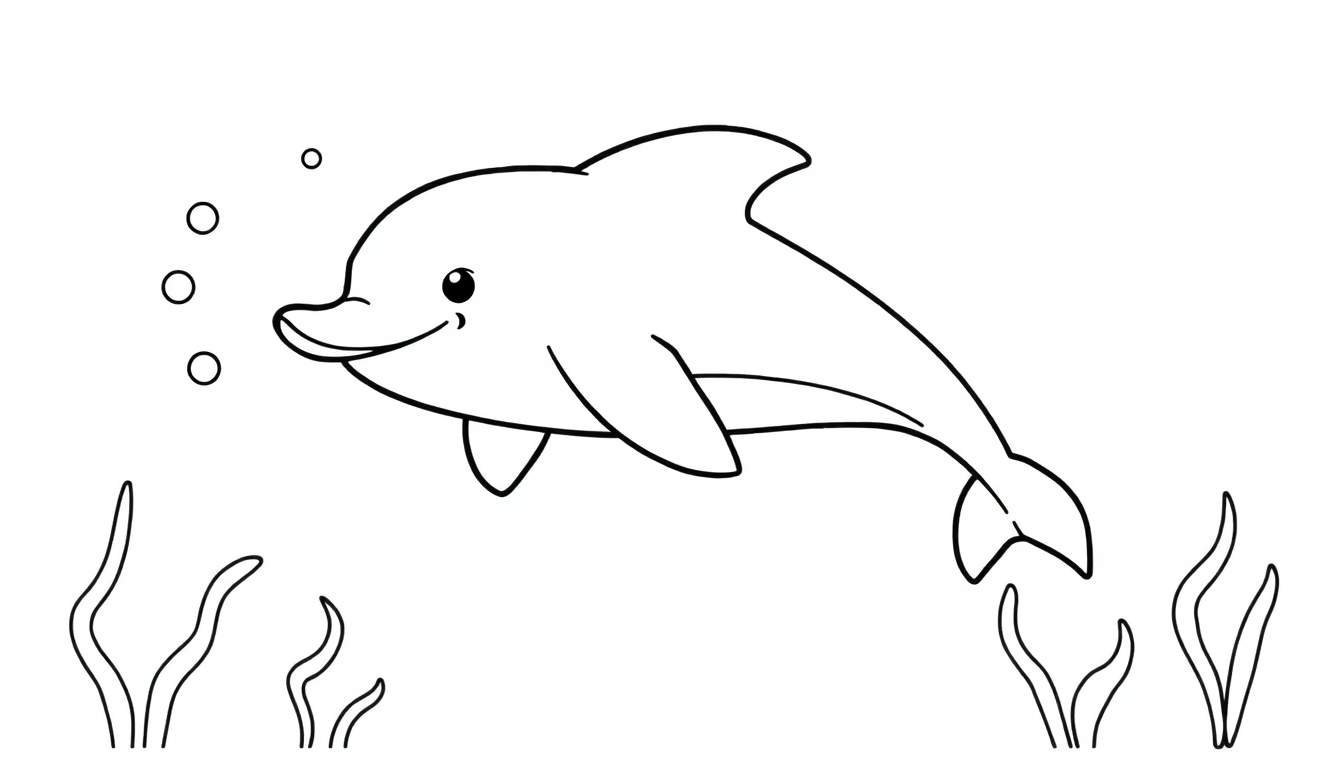 Download deze gratis kleurplaat van een schattige dolfijn! Perfect voor kinderen om te kleuren. De afbeelding bevat een lachende dolfijn, bubbeltjes en zeewier. Ideaal voor eindeloos kleurplezier.
