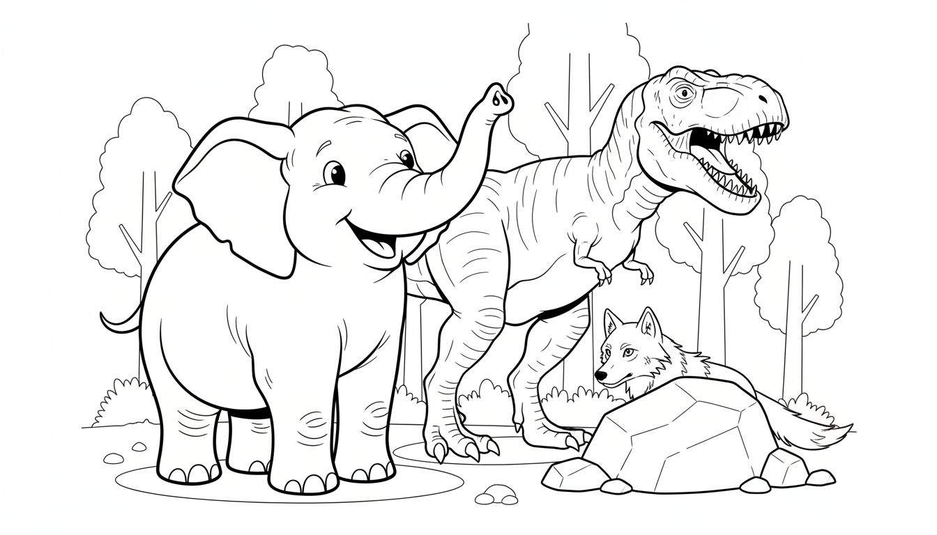 Leuke Kleurplaat: Vrolijke Olifant, T-Rex en Wolf in de Natuur