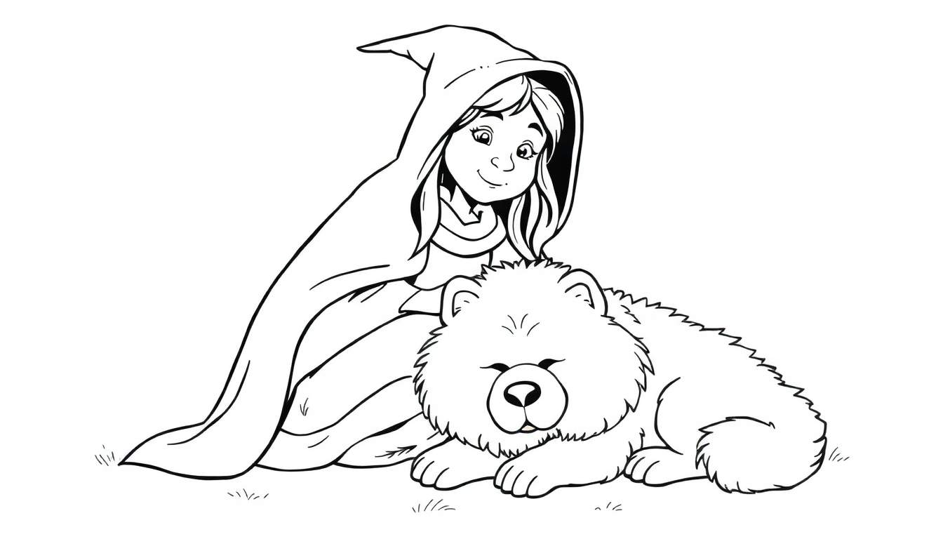 Duik in een wereld van rust en zachtheid met deze schattige kleurplaat! Je ziet een jong meisje, gehuld in een mysterieuze mantel met een puntige capuchon, die liefdevol neerziet op het dier naast haar. Haar haar valt speels onder de capuchon vandaan en een zachte glimlach siert haar gezicht. Het dier, een bol en heerlijk pluizig wezentje dat doet denken aan een beerwelp of een dikke, harige hond zoals een Chow Chow, lijkt volkomen vredig. Met gesloten of halfgesloten oogjes straalt het dier pure ontspanning uit. Samen zitten ze op de aarde, omringd door enkele getekende grashalmen, wat de suggestie wekt van een idyllisch moment in de vrije natuur.