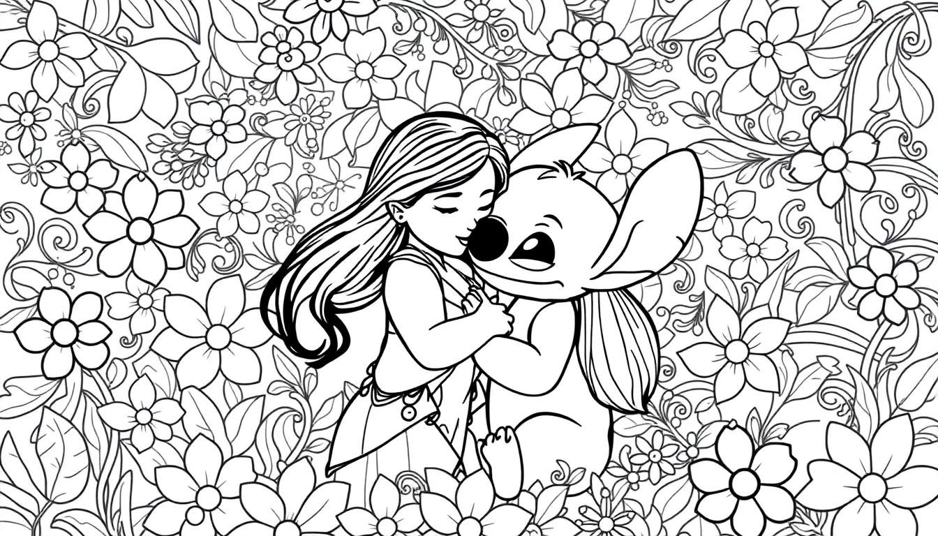 Een schattige zwart-wit kleurplaat van Lilo en Stitch die elkaar omhelzen te midden van een weelderig bloemenpatroon. Perfect om je creativiteit de vrije loop te laten en dit iconische duo in te kleuren!