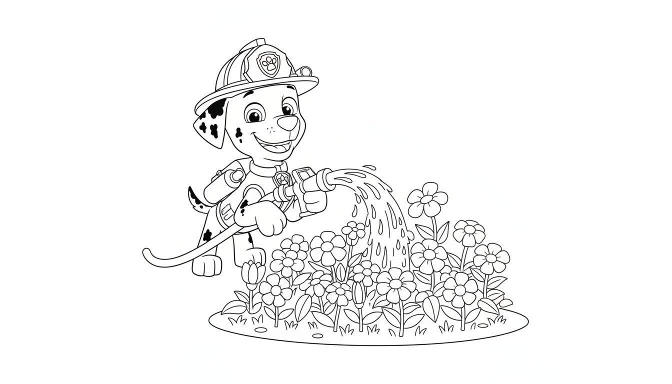 Deze kleurplaat vangt perfect Marshalls behulpzame en vriendelijke karakter. Hoewel we hem meestal zien rennen en branden blussen, laat deze afbeelding een zachtere kant zien. Het is een fantastische manier om kinderen te leren over verantwoordelijkheid en het belang van water geven aan planten, terwijl ze tegelijkertijd hun creativiteit de vrije loop laten met hun favoriete dalmatiër.