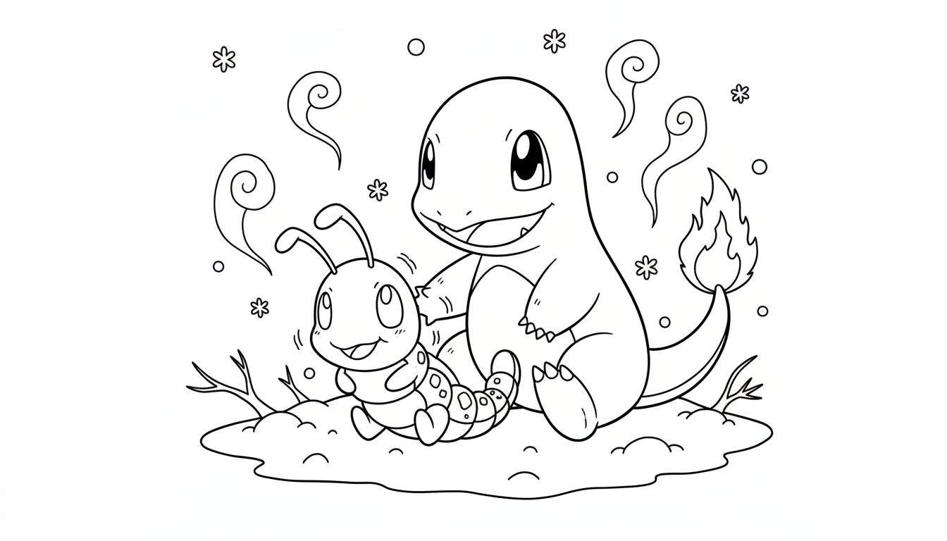Ontdek deze schattige kleurplaat van twee geliefde Pokémon! In het midden zie je de vrolijke Charmander, een hagedisachtige Vuurstarter, zittend met zijn kenmerkende staartvlam en een arm om de rupsachtige Caterpie. Caterpie kijkt blij omhoog met zijn antennes en stippen op zijn rug. Ze zitten samen op oneffen grond met kleine takjes. Rondom hen zweven speelse wervelingen, bloemachtige vormen, sterretjes en eenvoudige cirkels, wat zorgt voor een extra vrolijke en vriendelijke sfeer. Perfect voor jonge Pokémon-fans en creatieve geesten!