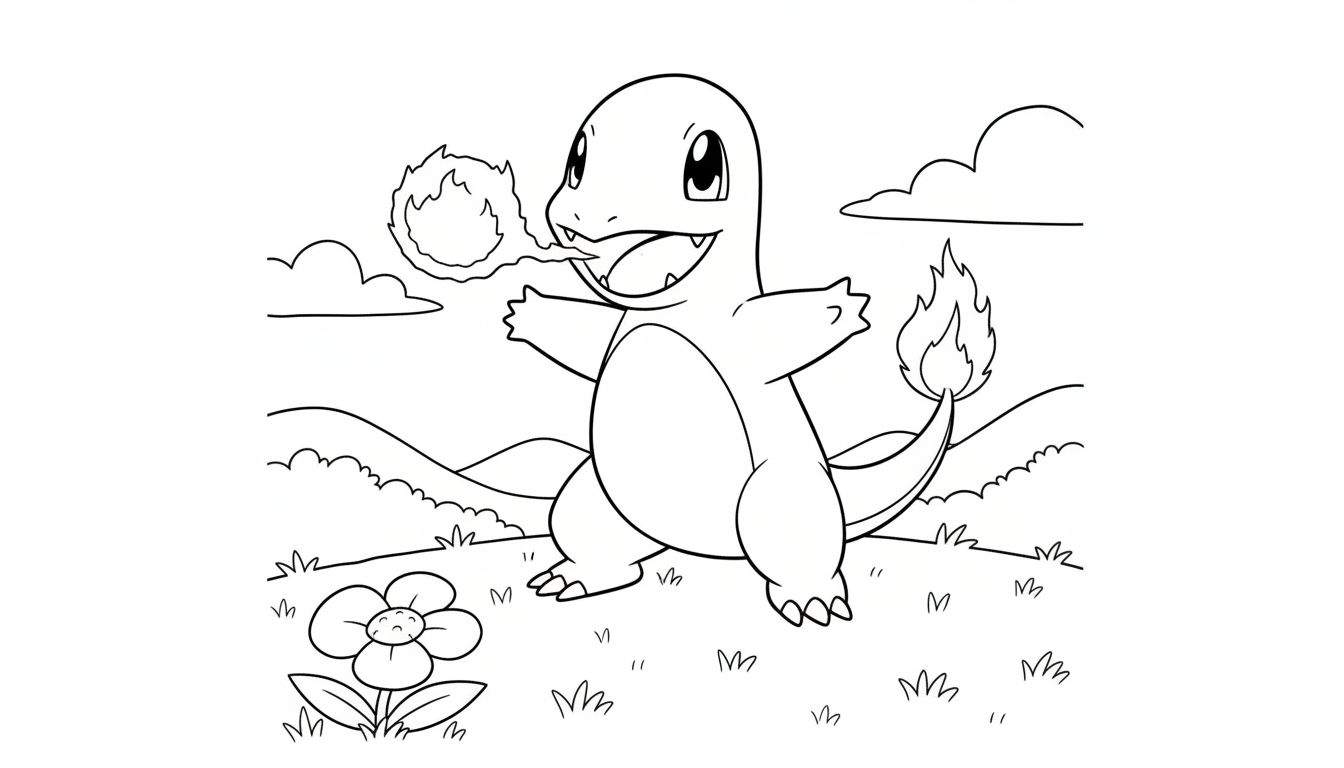 De kleurplaat vangt Charmander perfect in zijn element: met een brede lach en grote, vrolijke ogen spuwt hij speels een bal van vuur, terwijl de kenmerkende vlam op zijn staart onafgebroken brandt. De achtergrond, met glooiende heuvels, kleine plukjes gras en twee wolken in de lucht, creëert een serene setting. Linksonder voegt een schattige bloem een extra detail toe, waardoor er volop ruimte is voor allerlei kleurcombinaties en artistieke expressie.