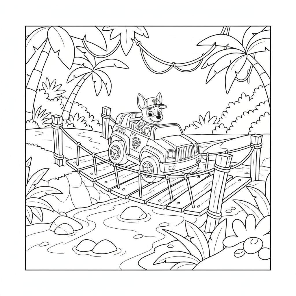 Chase Kleurplaat: Paw Patrol Politiehond op Tropische Brug | Avontuur in Zijn Politiewagen