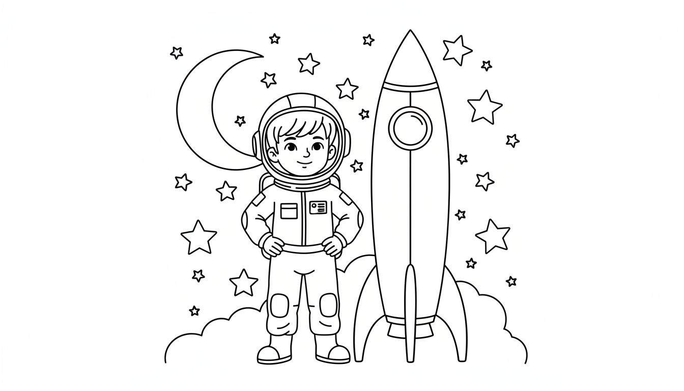 Een leuke zwart-wit kleurplaat voor kinderen met een vrolijke astronaut, een raket en een sterrenhemel. Perfect om de fantasie van kinderen te prikkelen en te leren over ruimtevaart.