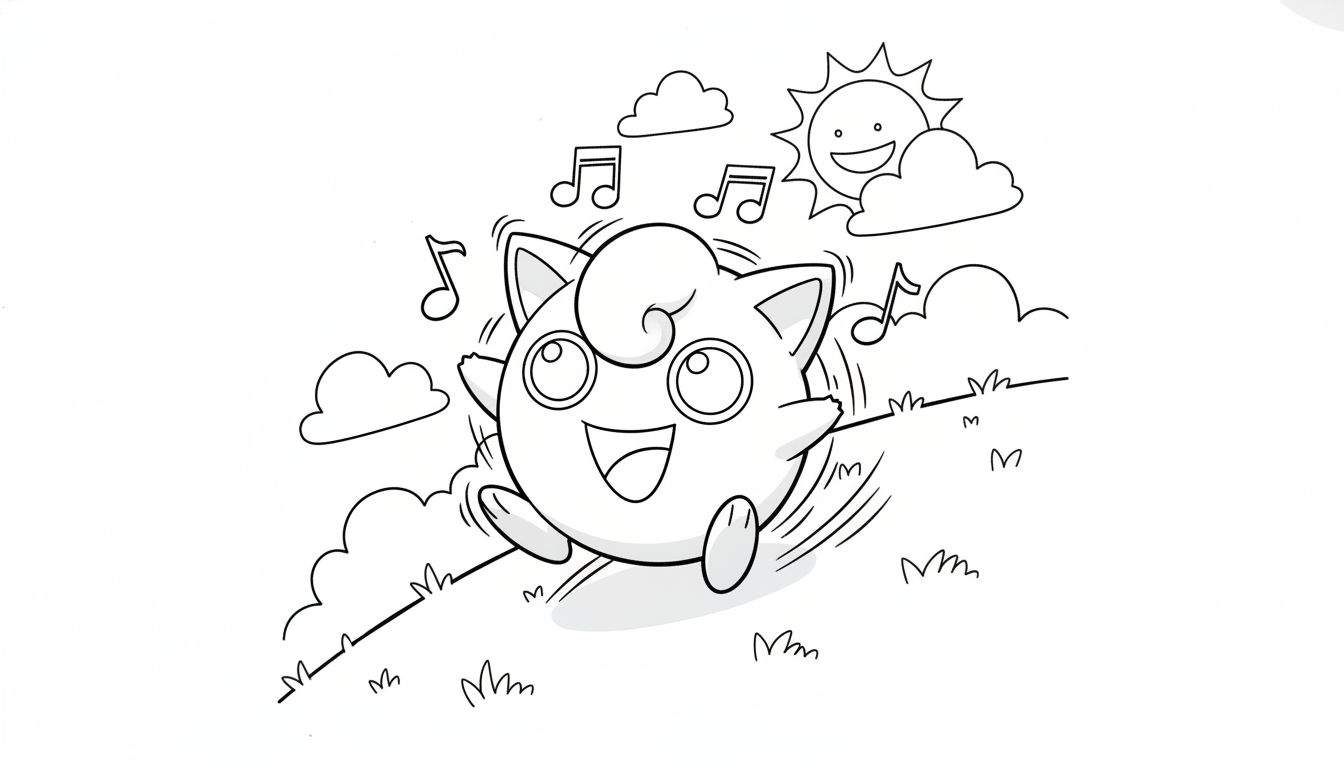 Deze vrolijke Jigglypuff kleurplaat toont het iconische Pokémon figuurtje zingend en zwevend tussen muzieknoten. Met een lachende zon en speelse wolken op de achtergrond, en eenvoudige grassprietjes onderaan. Een heerlijke activiteit voor Pokémon fans en creatieve kinderen.