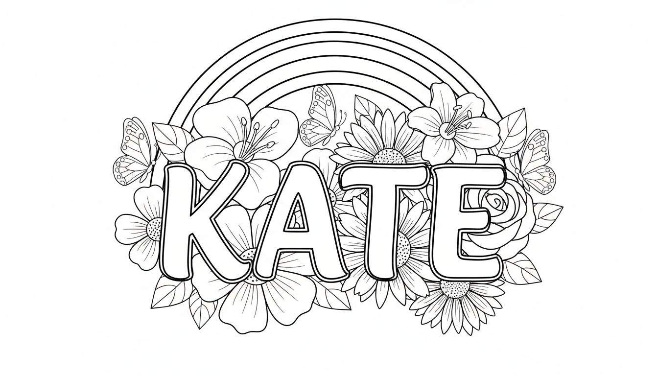 Deze prachtige kleurplaat, speciaal ontworpen voor creatieve jongeren, toont de naam “KATE” in grote, omrande letters die uitnodigen om gevuld te worden met levendige kleuren. Boven de naam prijkt een zonnige regenboog, opgebouwd uit drie concentrische bogen, die een belofte van vreugde en kleur brengt. De letters en de regenboog zijn omgeven door een weelderige tuin van bloemen en bladeren. Je vindt er diverse bloemsoorten, van weelderige bloesems tot vrolijke bloemen die doen denken aan zonnebloemen of madeliefjes. En als kers op de taart, fladderen er tussen al dit moois enkele speelse vlinders, die de natuurlijke en speelse sfeer van de tekening compleet maken.