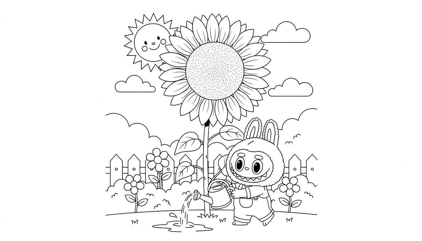 Labubu Kleurplaat: Vrolijk Konijntje Tuiniert bij Enorme Zonnebloem en Lachende Zon