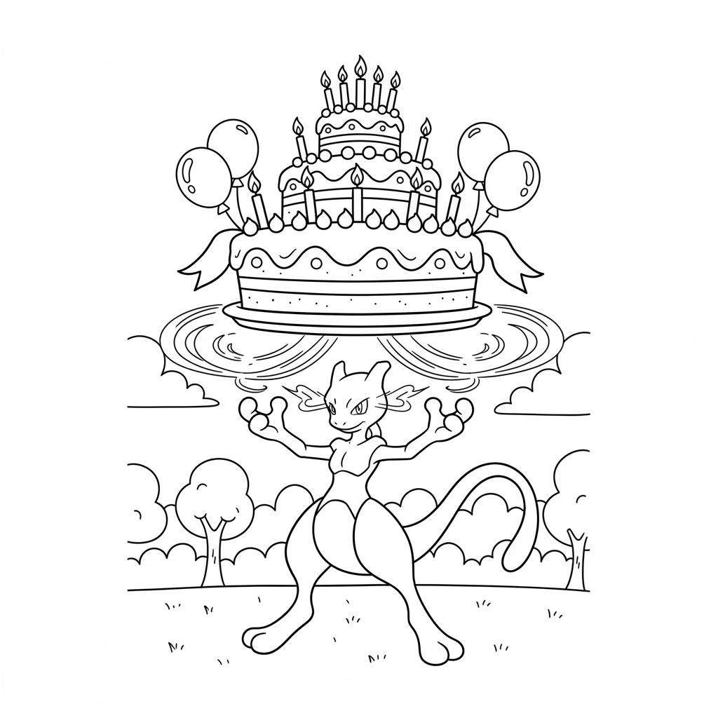 De detailrijke verjaardagstaart is een feest op zich, met meerdere lagen, talrijke brandende kaarsjes, vrolijke ballontrossen die aan de zijkanten hangen, en een elegant lint om de onderste laag. De achtergrond met eenvoudige struiken, bomen en gras-achtige streepjes biedt een kalm contrast met de dynamiek van Mewtwo en de taart, waardoor je alle ruimte hebt om je creativiteit de vrije loop te laten. Denk eens aan paarse tinten voor Mewtwo’s krachten, felle kleuren voor de taart, en natuurlijke groentinten voor het landschap!
