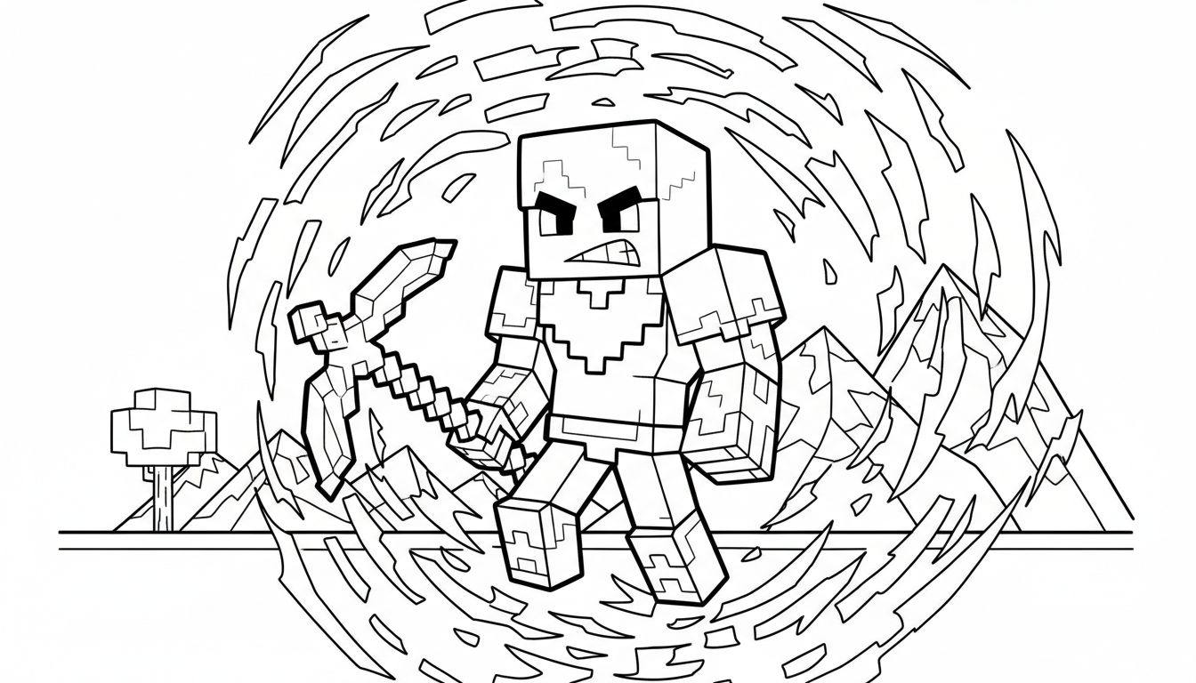 Download deze unieke Minecraft kleurplaat! Een vastberaden personage in blokkerige stijl, gehuld in harnas en met een houweel, omringd door dynamische energie-uitbarstingen. Achtergrond met blokkerige bergen en een boom. Perfect voor jonge Minecraft-fans om tot leven te brengen met kleur!