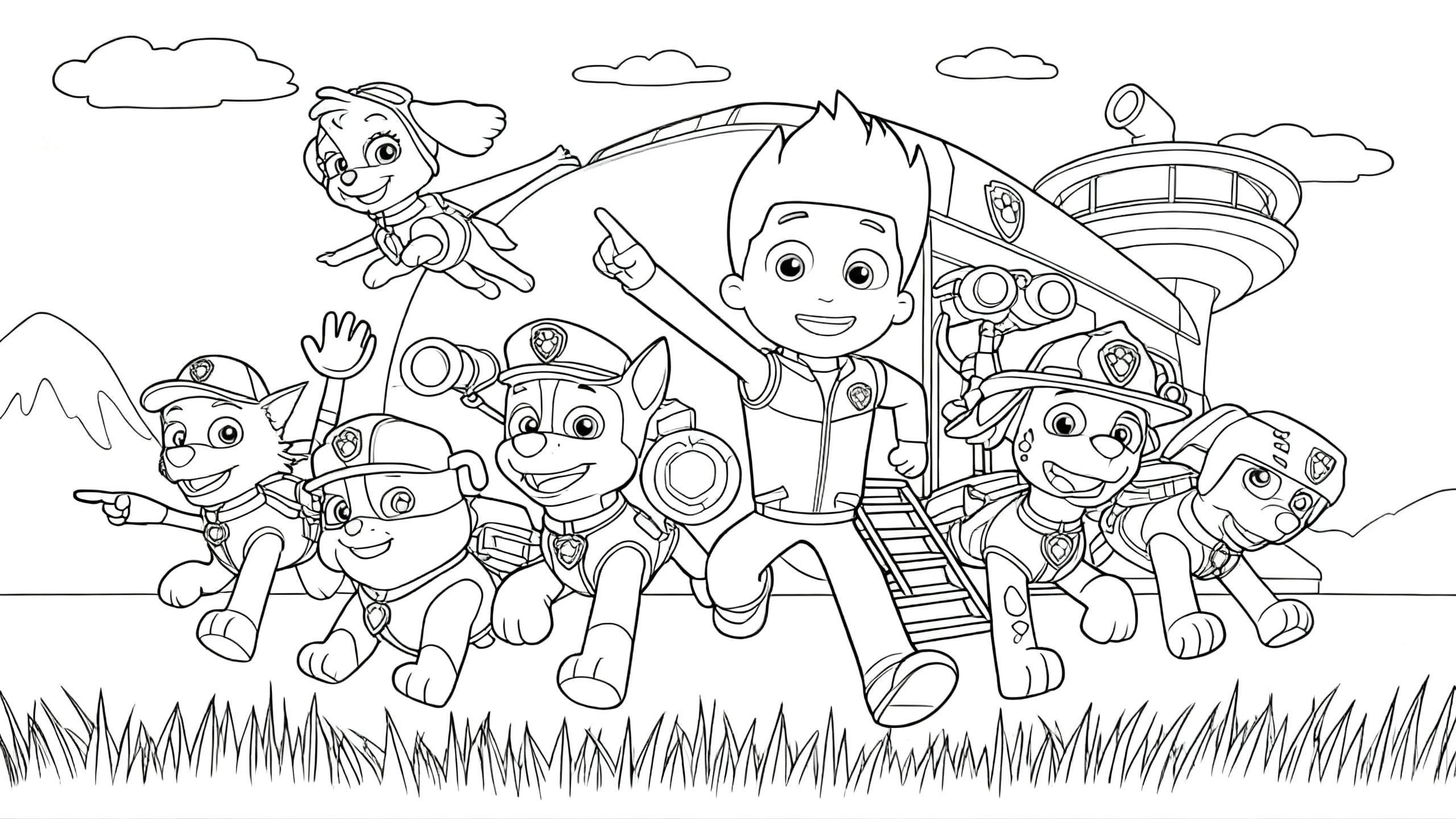 Deze fantastische zwart-wit lijntekening brengt de complete Paw Patrol-ploeg tot leven, klaar voor hun volgende missie! Centraal staat Ryder, de energieke leider, die vol enthousiasme naar voren wijst, omringd door zijn trouwe viervoeters. Het plaatje straalt actie en avontuur uit, perfect voor elke jonge fan die de wereld van Adventure Bay graag met kleur wil invullen. Van de vrolijke blikken tot de dynamische poses, deze kleurplaat is een uitnodiging om creatief aan de slag te gaan.