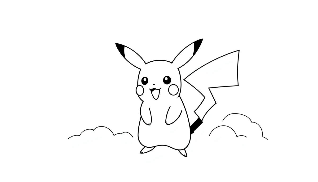 Een gedetailleerde lijntekening van Pikachu, het iconische Pokémon-personage. Deze kleurplaat toont Pikachu rechtop, met zijn kenmerkende puntige oren, ronde ogen, bolle wangen en open mond. De bliksemvormige staart is duidelijk zichtbaar. Onder hem bevinden zich eenvoudige wolkachtige vormen die een speelse ondergrond creëren, perfect om zelf in te kleuren.