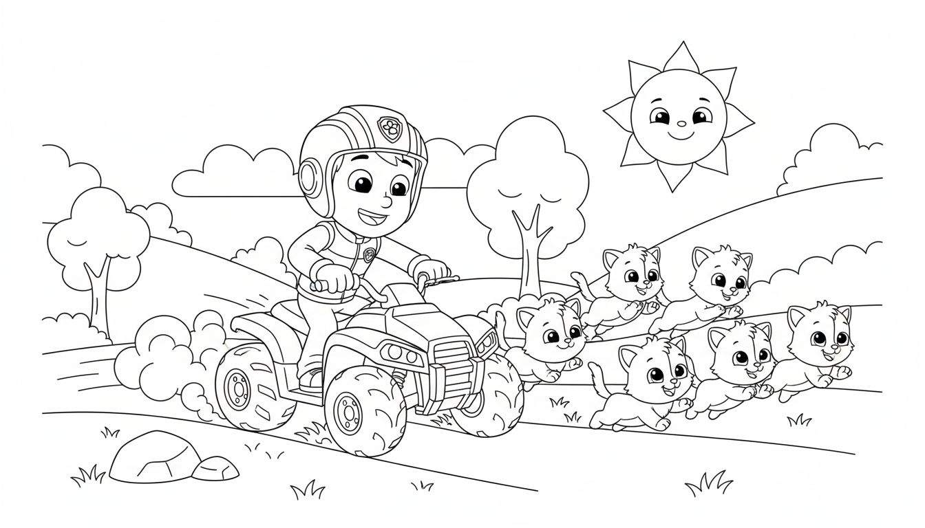 Ryder Quad Avontuur Kleurplaat met Lachende Katten | Vrolijke Buitenscène
