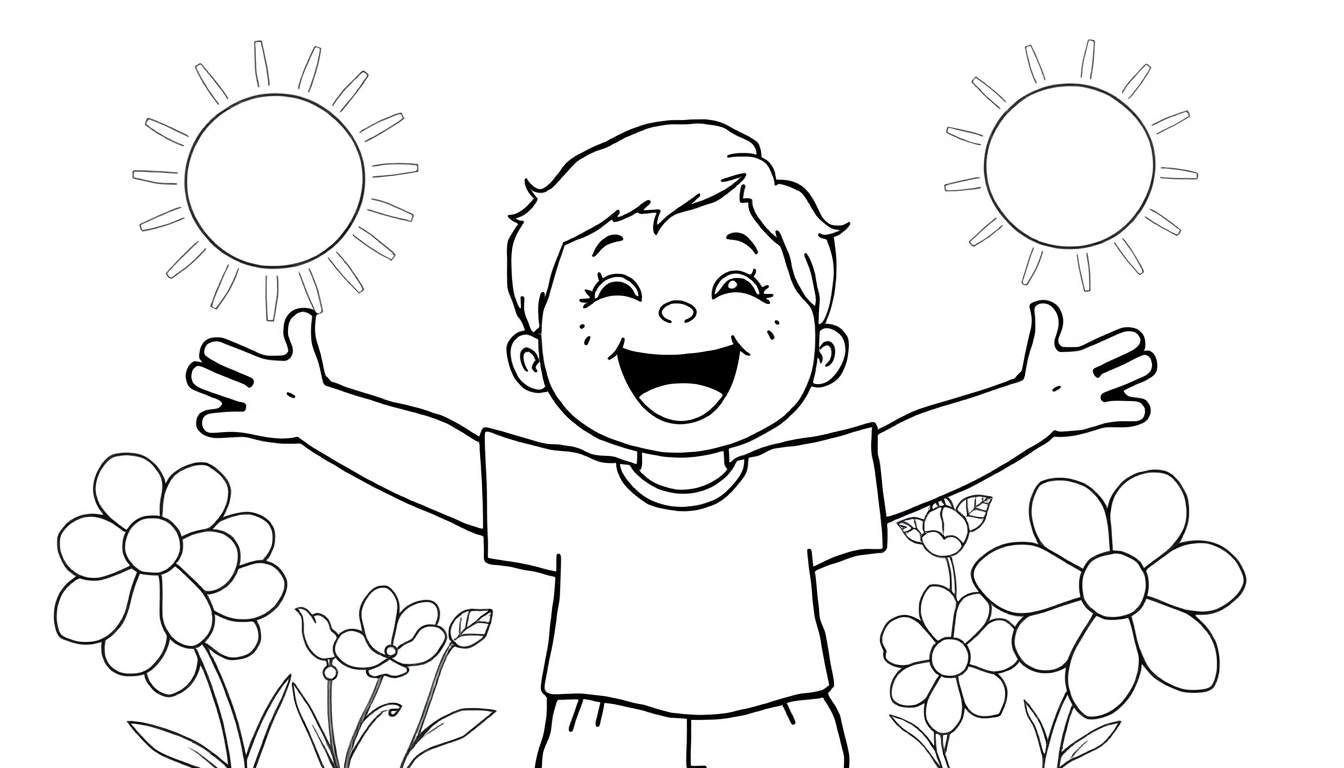 Deze schattige zwart-wit kleurplaat brengt gegarandeerd een glimlach op ieders gezicht. Centraal staat een onweerstaanbaar vrolijk kind, een jongetje met speelse korte haren en charmante sproetjes. Zijn brede lach en wijd gespreide armen nodigen uit tot vreugde en omarming. De twee zonnen die boven zijn handen zweven, stralen warmte en positiviteit uit, terwijl de vrolijke bloemen aan de onderkant de sfeer van een zonnige lentedag compleet maken.