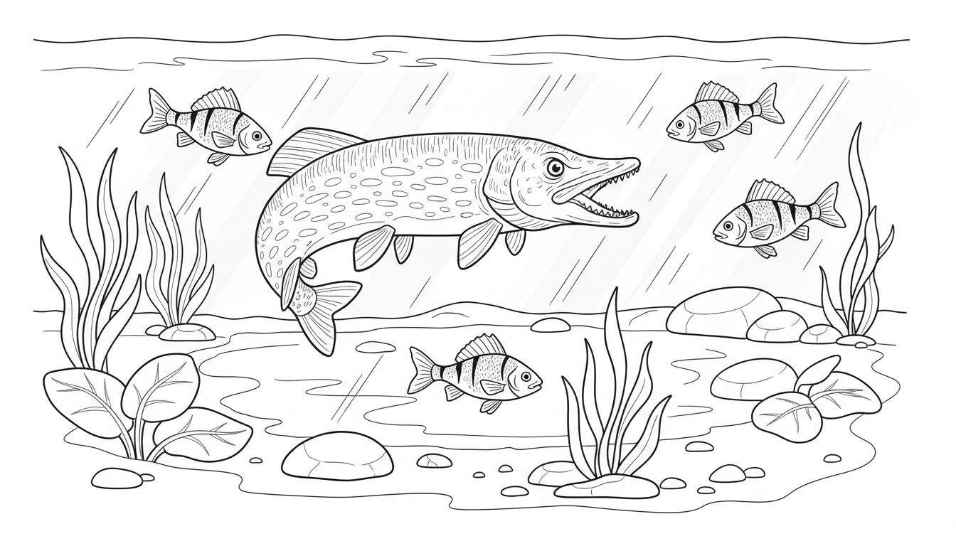 Ontdek de fascinerende onderwaterwereld met deze gedetailleerde kleurplaat! Centraal staat een indrukwekkende snoek met scherpe tanden, omringd door speelse baarsjes met hun kenmerkende strepen. Geniet van de rijke details van waterplanten en rotsen op de waterbodem, en laat je creativiteit de vrije loop om deze levendige scène in te kleuren. Perfect voor jong en oud die van de oceaan houden!