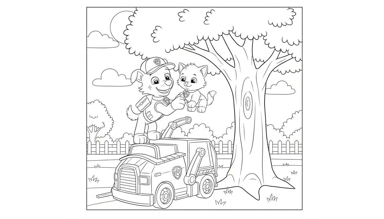 Op deze betoverende zwart-wit kleurplaat ontmoeten we Rocky, de milieubewuste pup van Paw Patrol, in een hartverwarmend tafereel. Hij staat trots op zijn kenmerkende recyclingwagen, klaar om de dag te redden, maar neemt even de tijd voor een bijzondere ontmoeting. Naast hem zit een klein, glimlachend poesje, wat de scène een extra laagje schattigheid en tederheid geeft. De gedetailleerde achtergrond, met een grote boom, zwevende wolken, een houten hek en weelderig gras, nodigt uit tot urenlang kleurplezier en stimuleert de verbeelding van elk kind.