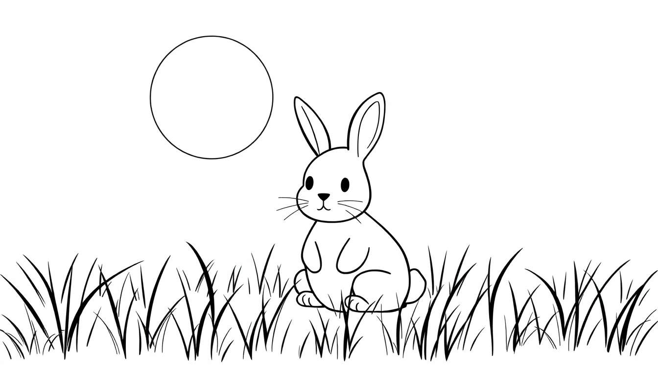 Een eenvoudige zwart-wit lijntekening van een schattig konijn zittend in het gras, met een grote lege cirkel erboven. Perfect als kleurplaat voor kinderen.
