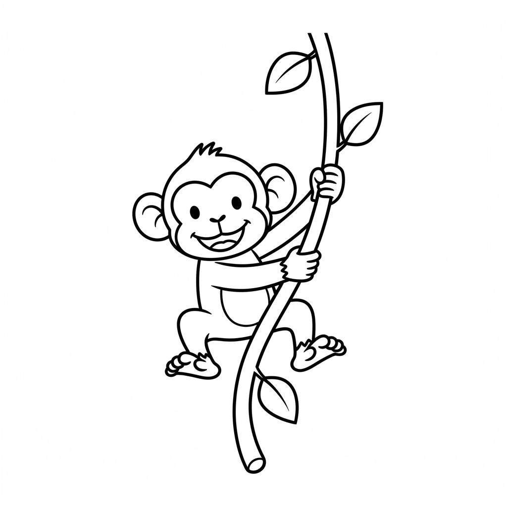 Deze hartverwarmende zwart-wit lijntekening toont een vrolijk en schattig aapje dat breed lacht. Het aapje houdt zich stevig vast met beide handen aan een dikke verticale liaan of tak, waaraan ook enkele bladeren te zien zijn. De dynamische pose suggereert dat het aapje net aan het slingeren of klimmen is, wat zorgt voor een levendige scène. Deze eenvoudige kleurplaat is perfect voor jonge kinderen en beginners, en nodigt uit tot creativiteit met kleuren. Een perfecte activiteit voor een ontspannen moment.