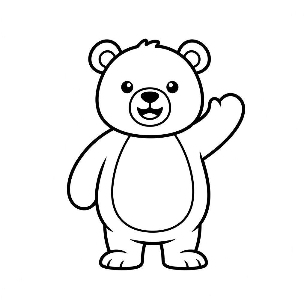 Een hartverwarmende, cartoonachtige zwart-wit lijntekening van een vriendelijke beer. Deze makkelijke kleurplaat toont de beer rechtopstaand, met zijn linkerpoot (vanaf de kijker gezien de rechterpoot) omhoog, alsof hij vrolijk zwaait of hallo zegt. Met zijn ronde oogjes, kleine neus en brede glimlach straalt hij pure vriendelijkheid uit, ideaal voor jonge kinderen en beginners die van beren houden.