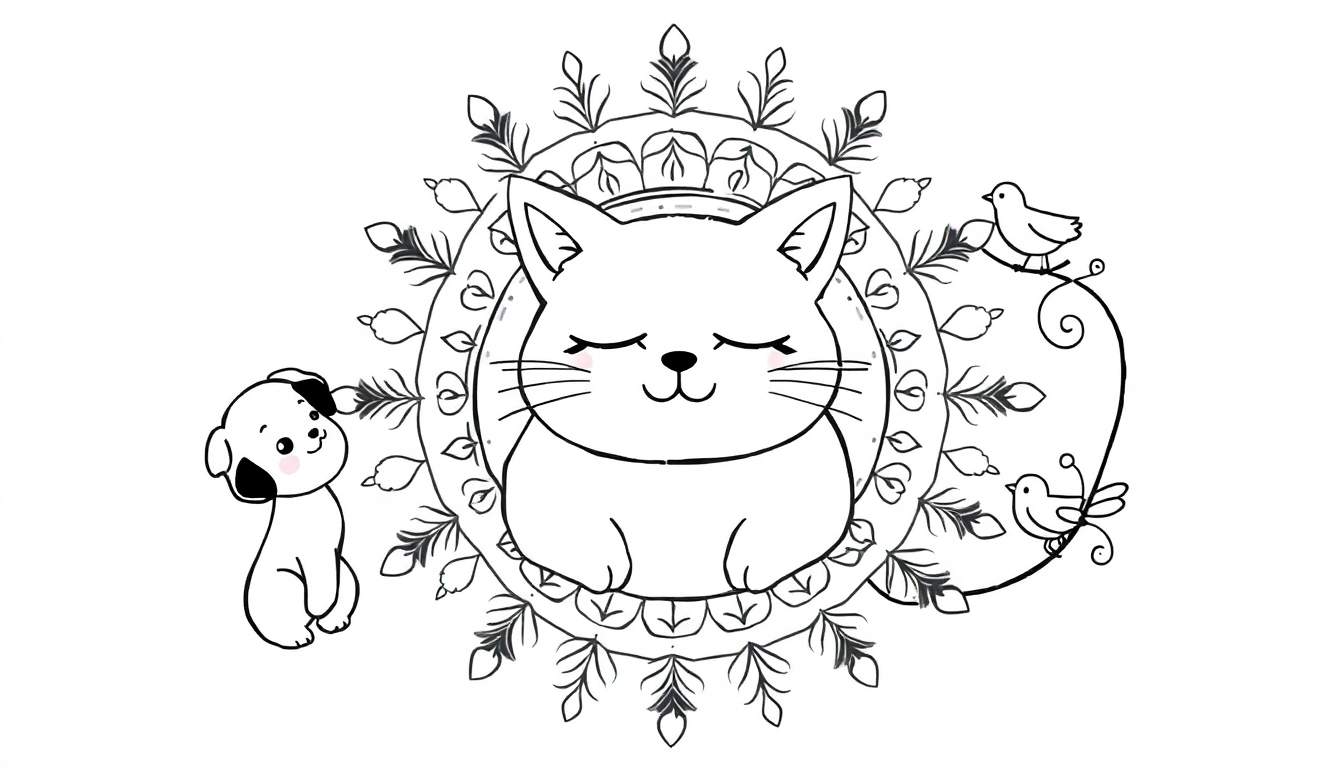 Ontdek deze charmante zwart-witte lijntekening vol schattige dieren! Een vredige kat mediteert in een mandala, vergezeld door een nieuwsgierig hondje en twee vrolijke vogeltjes. Perfect voor eindeloos kleurplezier voor jong en oud.