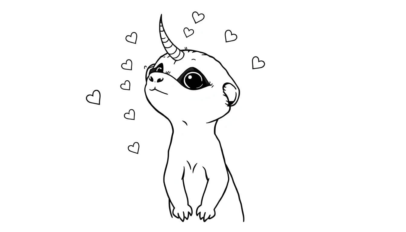 Ontdek deze schattige zwart-witte lijntekening van een eenhoorn stokstaartje, perfect om in te kleuren! Met grote ogen, een spitse hoorn en zwevende hartjes. Ideaal voor creatieve kinderen en liefhebbers van lieve dieren.