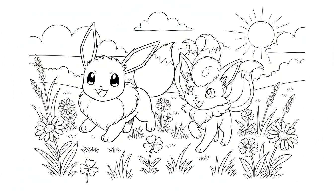 Wist je dat Eevee bekend staat om zijn vele evoluties, elk met een ander type? En Vulpix, zeker de Alolan-versie, is beroemd om zijn prachtige ijs-type uiterlijk! Bij het inkleuren kun je experimenteren met verschillende texturen: een zachte, donzige vacht voor Eevee en Vulpix, glanzende bloemblaadjes en stevige grasstengels. Overweeg ook om de hemel een mooie blauwtint te geven en de zon stralend geel, of juist een zonsondergang met warme roze en oranje tinten. Er zijn geen regels, alleen plezier!