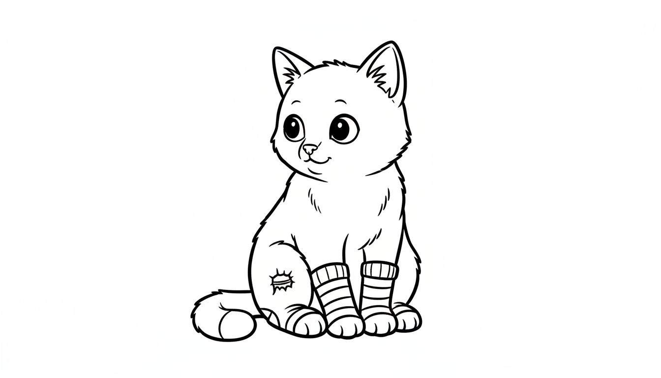 Een lieve zwart-wit lijntekening van een cartoonachtige kat met grote, ronde ogen, een glimlach, gestreepte sokken en een opgenaaid lapje op zijn poot. Perfect om in te kleuren en creativiteit te uiten. Ideaal voor kinderen en kattenliefhebbers.