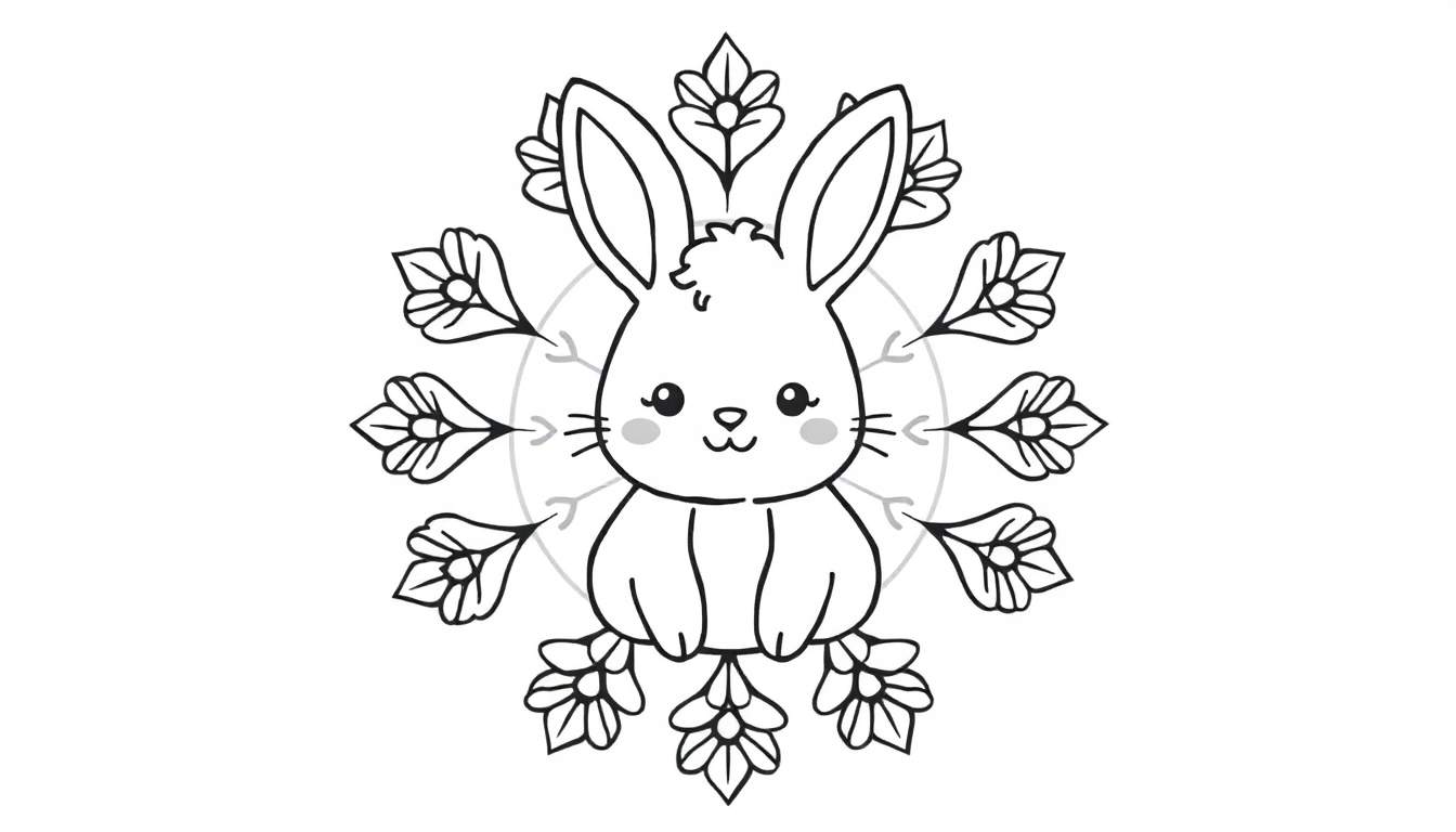 Dit betoverende kleurplaatje toont een lief konijntje dat centraal staat, rechtop zittend met zijn lange oren omhoog gespitst. Met zijn grote, vriendelijke ogen, kleine wangetjes en een glimlachende mond is hij direct vertederend. Het konijntje is omringd door een prachtig, symmetrisch patroon dat doet denken aan een mandala, opgebouwd uit gestileerde bladeren of bloemblaadjes. De subtiele grijze pijltjes op de achtergrond voegen een uniek, schetsachtig element toe, waardoor het lijkt alsof dit ontwerp met zorg is voorbereid om jou te inspireren.