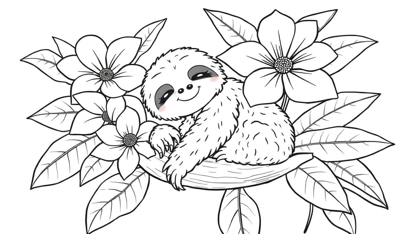 Dit betoverende lijntekening, perfect om in te kleuren, toont een ontzettend schattige luiaard die midden op het beeld pronkt. De luiaard hangt vredig aan een stevige tak en straalt pure vreugde uit met zijn zachte glimlach en lichte blosjes op de wangen. Zijn kenmerkende donkere oogvlekken geven hem een extra lieve uitstraling. Omringd door een overvloed aan bloemen en bladeren, creëert deze kleurplaat een harmonieus en uitnodigend tafereel. De bloemen zijn rijk aan detail met hun grote, overlappende bloemblaadjes en een centraal, gestippeld hart, terwijl de bladeren de finesse van hun nerven laten zien. Dit alles resulteert in een vrolijke en vriendelijke uitstraling die kinderen (en volwassenen!) aanmoedigt om hun creativiteit de vrije loop te laten en dit plaatje in te kleuren.