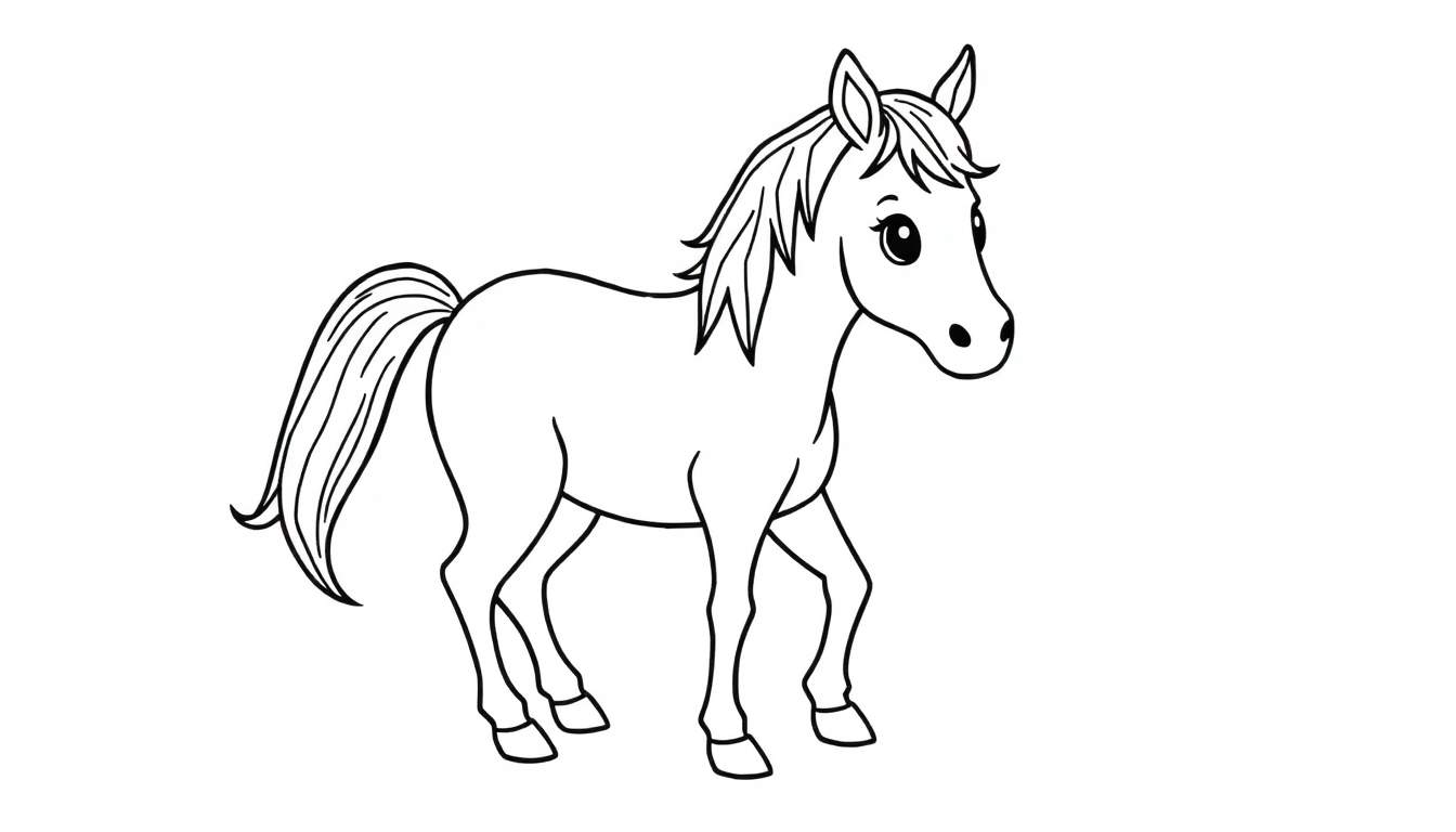 Een lieve lijntekening van een paard, perfect om in te kleuren! Deze cartoonachtige kleurplaat met dikke lijnen en grote ogen is ideaal voor kinderen en paardenliefhebbers. Gratis te downloaden.