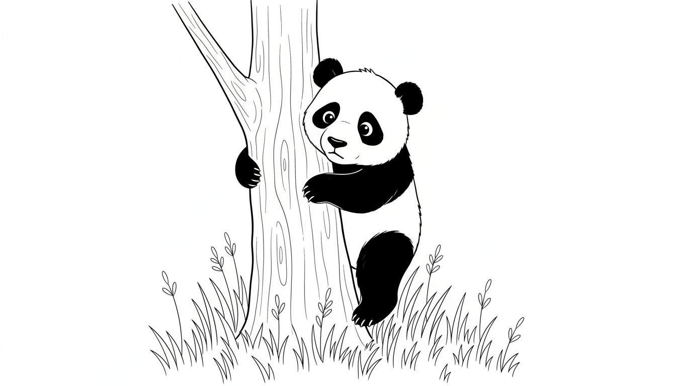 Stap in de wondere wereld van de panda met deze betoverende kleurplaat! Centraal in dit zwart-wit lijntekening staat een onweerstaanbaar schattige, jonge panda. Met zijn iconische zwart-witte vacht, grote nieuwsgierige ogen en een speelse houding, is hij er helemaal klaar voor om tot leven te komen met jouw favoriete kleuren. De panda gluurt om de stam van een eenvoudige, getekende boom heen, met hier en daar wat gras en plantjes aan de onderkant die de natuurlijke omgeving compleet maken. De cartoonachtige stijl maakt deze kleurplaat niet alleen toegankelijk, maar ook enorm leuk om mee aan de slag te gaan.
