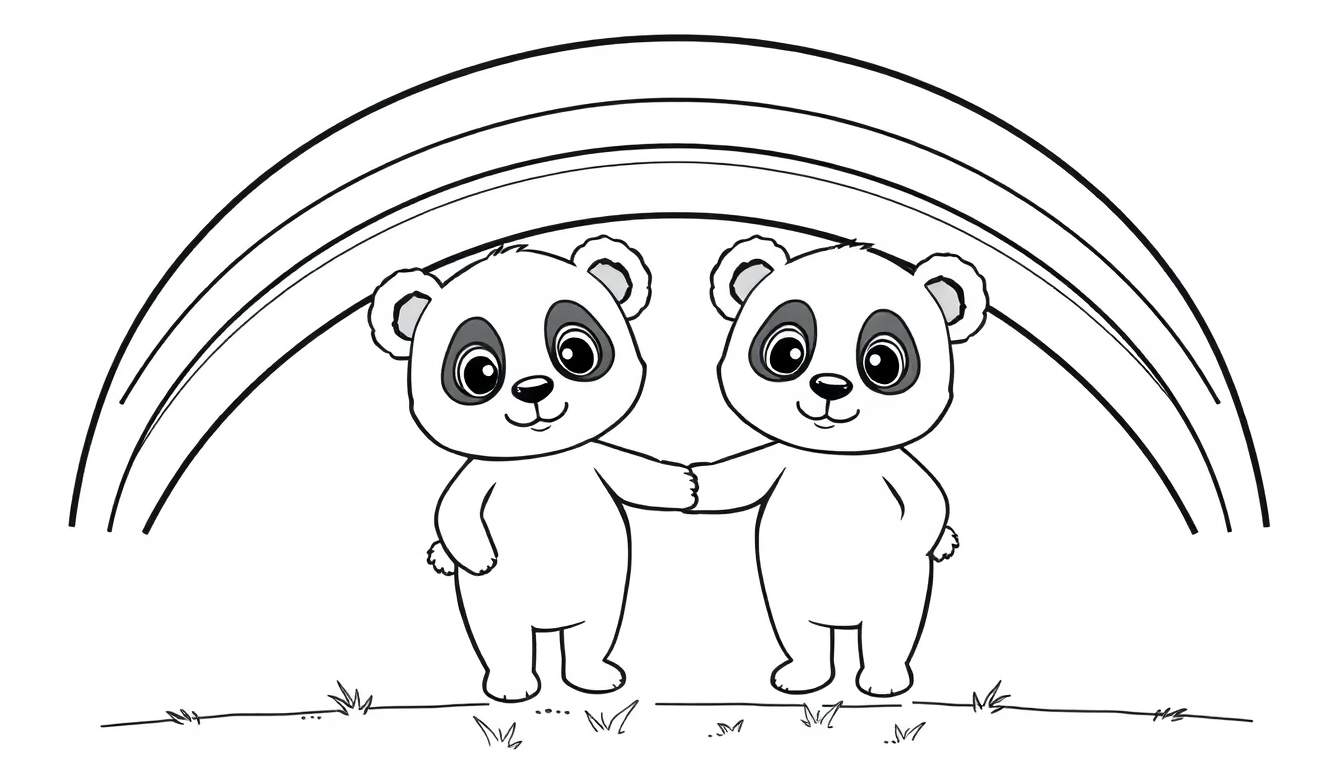 Gratis te downloaden kleurplaat van twee lieve panda’s die hand in hand staan onder een kleurrijke regenboog. Perfect voor kinderen om creatief bezig te zijn met vrolijke kleuren.