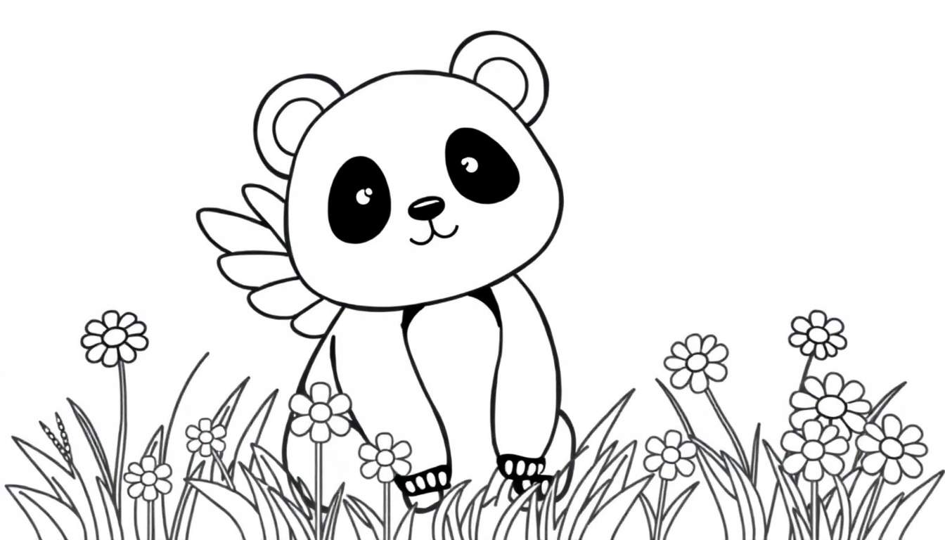 Stap in een wereld van fantasie met onze betoverende kleurplaat! Deze unieke tekening toont een tedere panda, niet zomaar een panda, maar een met kleine, schattige vleugels op zijn rug. De panda zit vredig te midden van een veld vol sierlijke bloemen en wuivend gras, en straalt een en al vriendelijkheid uit met zijn bekende donkere oogvlekken, schattige oorvlekken en een glimlachend mondje. De eenvoudige lijnen en contouren maken dit plaatje perfect voor alle leeftijden om in te kleuren en tot leven te brengen.