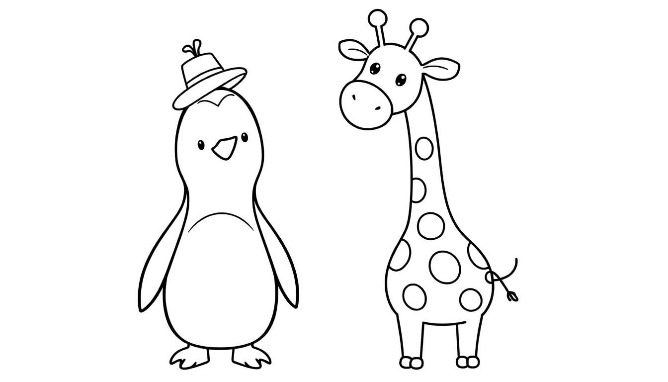 Deze charmante zwart-wit tekening brengt twee onweerstaanbare dieren samen: een vrolijke pinguïn met een grappig hoedje en een statige giraf, versierd met speelse stippen. Beide dieren kijken je met een vriendelijke blik aan, hun open bekjes nodigen uit tot lachen en hun stipogen stralen vrolijkheid uit. De cartoonachtige stijl maakt deze kleurplaat niet alleen toegankelijk voor de allerkleinsten, maar ook een plezier voor jong en oud om creatief mee aan de slag te gaan.