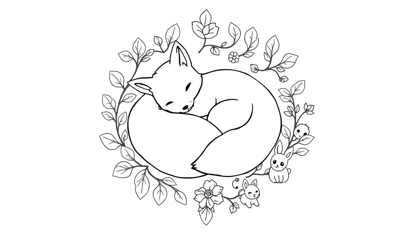 Deze betoverende kleurplaat nodigt uit tot creativiteit met zijn zachte, charmante lijntekening. In het hart van de compositie rust een schattige vos, opgerold in een vredige slaap. Zijn staart vormt een zachte omhelzing, terwijl zijn gesloten oogjes de rust van het moment uitstralen. De vos wordt omringd door een delicate krans van bladeren en takjes, die de natuurlijke schoonheid van het tafereel benadrukken. Deze groene omhelzing zorgt voor een serene achtergrond, klaar om ingekleurd te worden met levendige tinten.