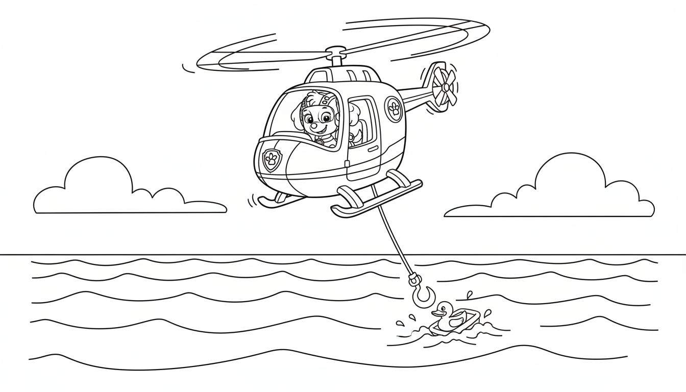 Ontdek deze spannende kleurplaat van Skye, de vrolijke Paw Patrol puppy, in haar helikopter! Ze vliegt boven golvend water met draaiende rotorbladen en een uitgeschoven takel. Haar missie? Een schattig speelgoedeendje redden dat in het water drijft. Perfect voor jonge fans van Paw Patrol en reddingsavonturen.
