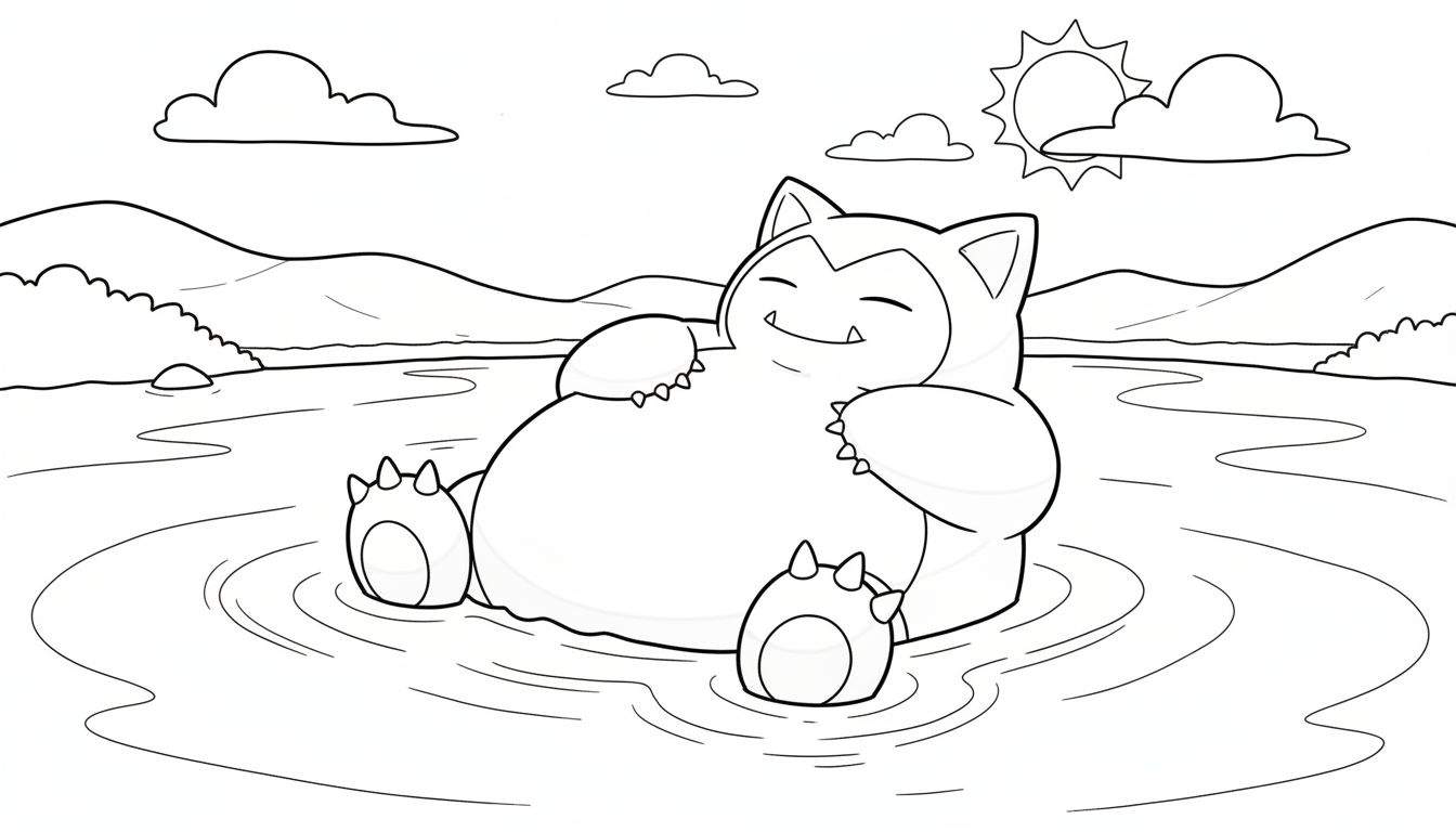Deze zwart-wit tekening toont Snorlax, de bekende Pokémon, heerlijk ontspannen in het water. Snorlax zit tot aan zijn borst of buik in het water, met een blije, lachende uitdrukking en bijna gesloten ogen. Zijn armen rusten comfortabel op zijn buik en zijn kleine, puntige voeten steken net boven het water uit. Rondom hem zijn duidelijke rimpelingen te zien. De achtergrond bestaat uit glooiende heuvels of bergen en weelderige struiken langs de oever aan de linkerkant. Bovenin de afbeelding zweven diverse wolken, terwijl aan de rechterkant een heldere zon schijnt. Het geheel straalt een kalme en vrolijke sfeer uit, perfect voor een ontspannende kleurervaring.