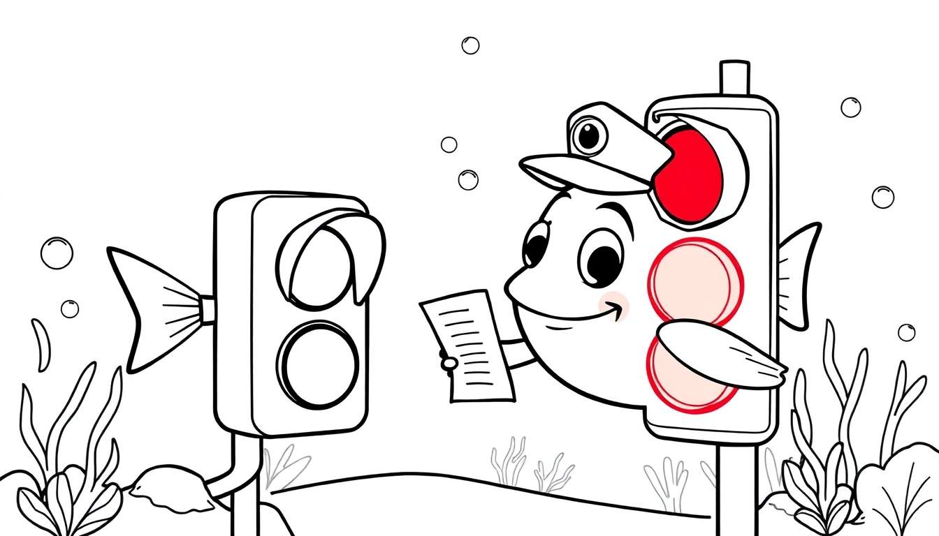 Deze unieke kleurplaat neemt je mee naar een betoverende onderwaterwereld, waar bekende objecten een verrassende draai krijgen. Centraal in dit schilderachtige tafereel staan twee bijzondere wezens: verkeerslichten vermomd als vissen. De linker vis is een simpel verkeerslicht met vissenstaart, klaar om zijn ‘verkeersregels’ te verkondigen. Aan zijn zijde staat een meer uitbundige versie: een vis-verkeerslicht met een expressief gezicht, complete met grote ogen, een lachende mond en zelfs een schattig roze blosje. Met een pet op zijn hoofd en een staart en vin, leest hij aandachtig een document, wat de fantasie prikkelt over zijn rol in dit oceaanrijk.