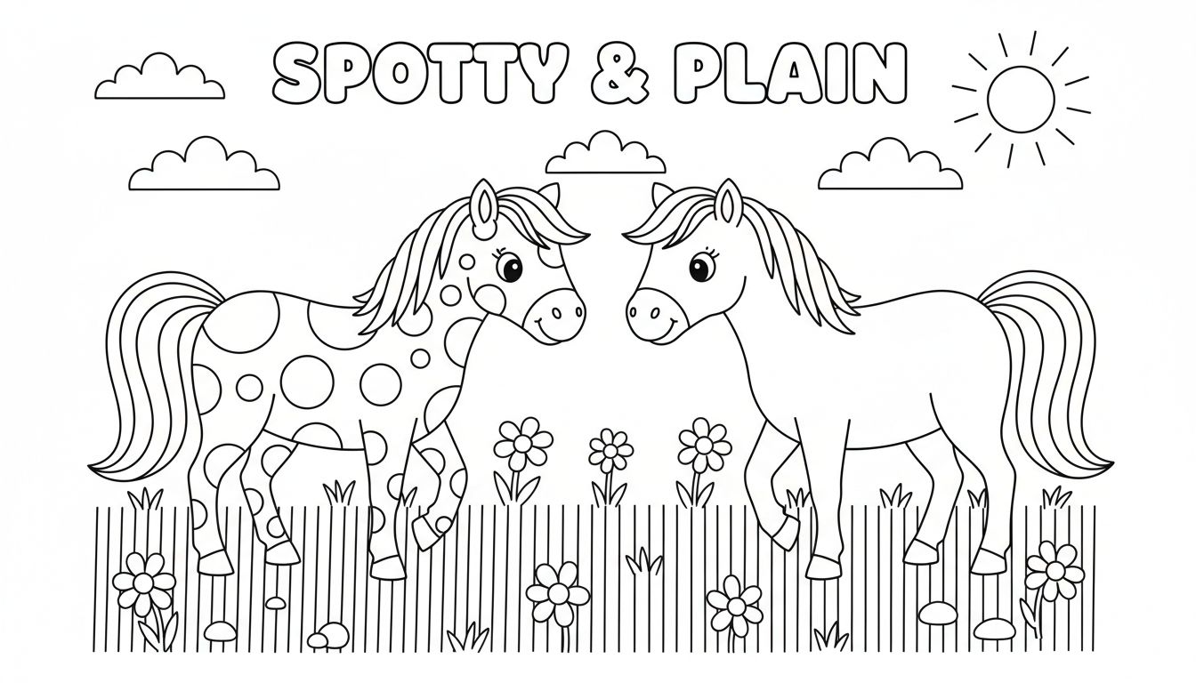 Wist je dat paarden die gevlekt zijn, zoals onze Spotty, vaak speciale namen krijgen die hun unieke vacht weerspiegelen? Denk aan Appaloosa paarden, bekend om hun opvallende vlekkenpatronen die lijken op een regenboog of stippen van verf. En Plain, het effen paard, kan worden gezien als de belichaming van elegantie en eenvoud. Misschien zijn Spotty en Plain wel beste vrienden die samen door uitgestrekte weiden rennen, waarbij Spotty de aandacht trekt met zijn levendige stippen en Plain een rustgevende aanwezigheid biedt. De tekst “SPOTTY & PLAIN” kan ook een metafoor zijn voor de schoonheid van diversiteit en het omarmen van verschillen, zelfs tussen de meest onwaarschijnlijke vrienden. Deze kleurplaat moedigt kinderen aan om te denken aan hoe verschillende karakters en uiterlijkheden elkaar kunnen aanvullen, net zoals de vrolijke zon en de zachte wolken de achtergrond compleet maken.