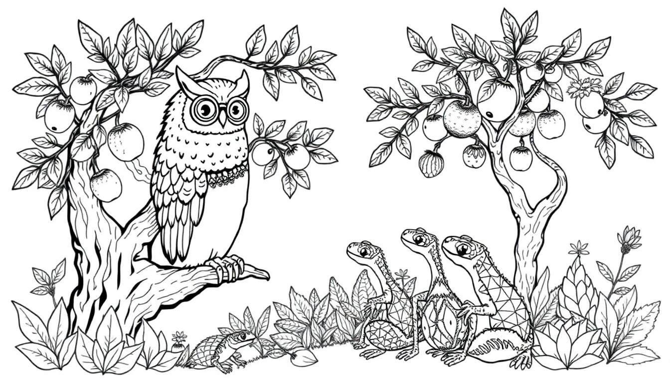 Een gedetailleerde zwart-wit kleurplaat met een magische bos- of tuinscène. Een wijze uil met bril zit op een appelboom, omringd door bladeren en vruchten. Op de grond verkennen geometrische hagedisjes de omgeving. Perfect voor creatieve ontspanning en fantasierijke inkleuring.