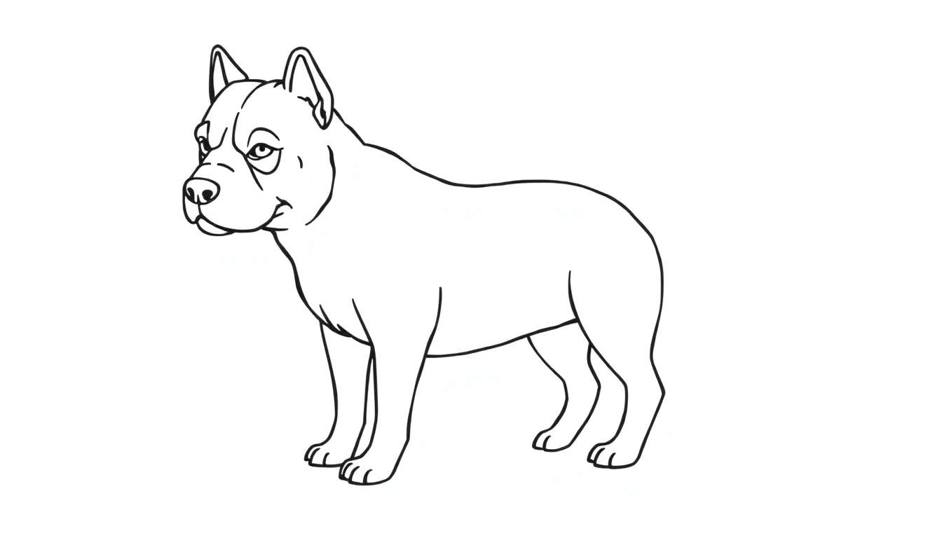 Duik in de wereld van creativiteit met deze fantastische kleurplaat van een stoere hond! De zwart-witte lijnen tekening toont een hond met een krachtige bouw, korte, puntige oren en een indrukwekkende snuit, die doet denken aan rassen als de bulldog of pitbull. Deze illustratie, met zijn eenvoudige schetsstijl, biedt eindeloze mogelijkheden om met jouw favoriete kleuren tot leven te komen. De hond staat fier op een effen witte achtergrond en kijkt zelfverzekerd naar links, klaar om jouw artistieke touch te ontvangen.