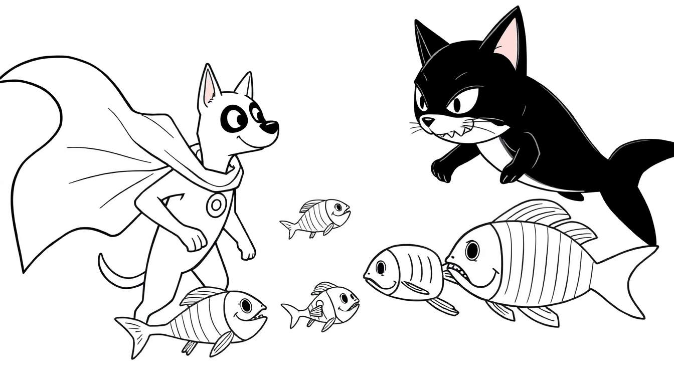 Kleurplaat van een dappere superheldenhond die het opneemt tegen een angstaanjagende kat-haai en agressieve vissen om kwetsbare vissen te beschermen. Een stripboekachtige zwart-wit tekening met een vleugje roze.