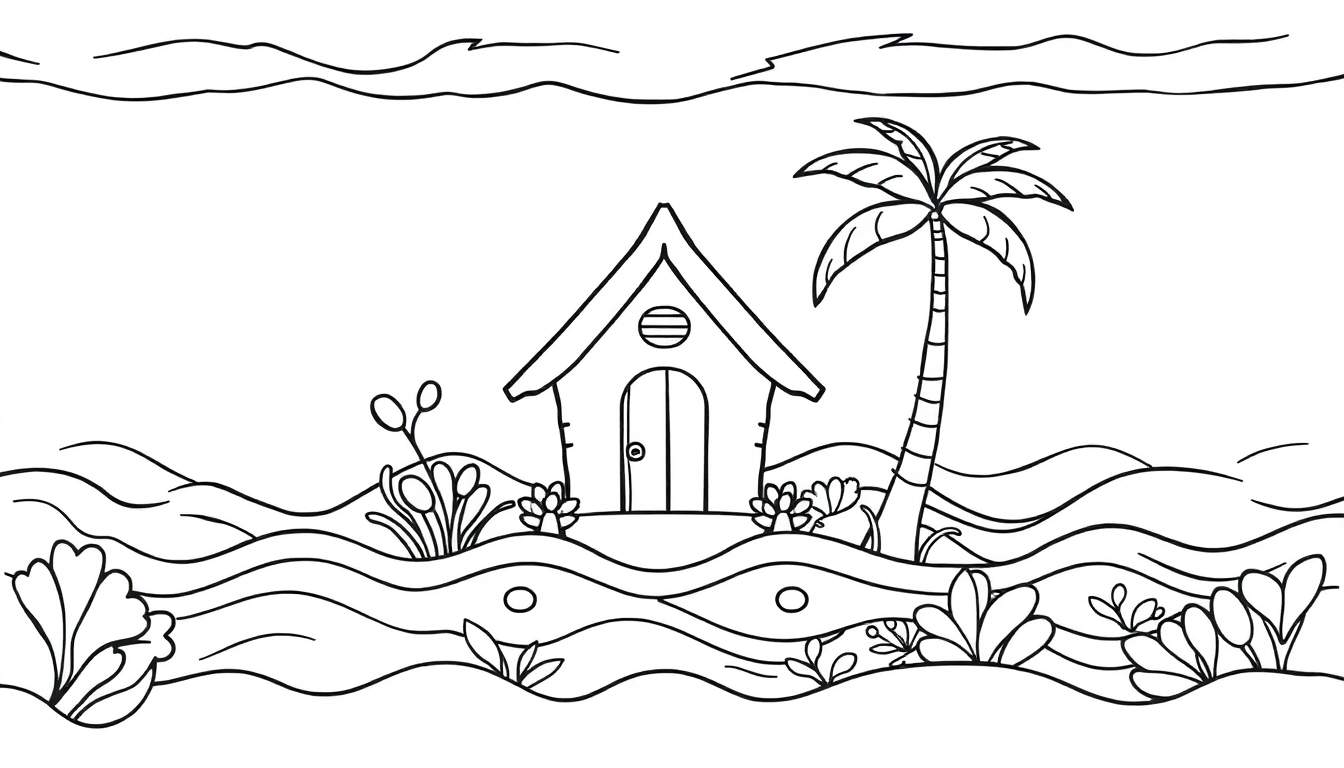 Stap binnen in een wereld van zonovergoten stranden en turquoise wateren met deze betoverende kleurplaat. De tekening beeldt een idyllisch tropisch landschap uit, waar een schattig huisje met een puntdak en afgeronde muren centraal staat. Het huisje, gelegen op een kleine heuvel, nodigt uit tot een kleurrijk avontuur. Rechts ervan torent een statige palmboom met weelderige bladeren fier omhoog, terwijl diverse planten en struiken het tafereel compleet maken met hun natuurlijke schoonheid. Dit is de ideale startpunt voor een creatieve ontsnapping naar een droombestemming.