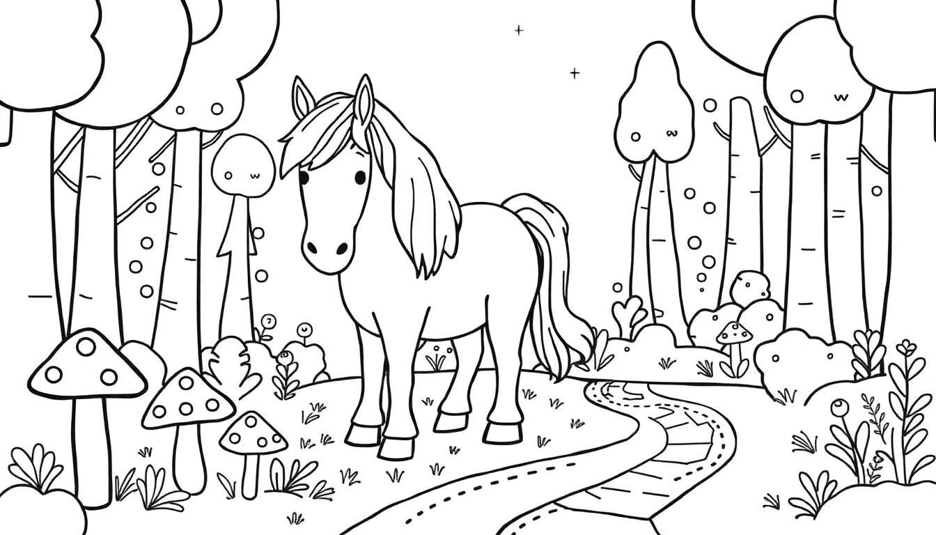 Een schattige zwart-wit lijntekening van een vriendelijk paard in een sprookjesachtig bos. Perfect om in te kleuren!