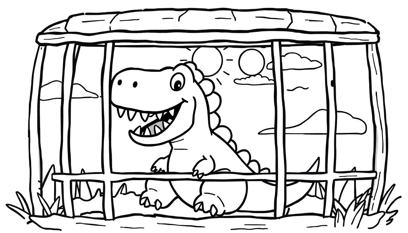 Laat de creativiteit van je kinderen de vrije loop met deze fantastische kleurplaat! In het midden van het beeld staat een onweerstaanbare, vriendelijke dinosaurus. Met zijn grote, glimmende ogen en een brede, puntige glimlach lijkt hij elk moment een grap te kunnen vertellen. De stekels op zijn rug voegen een speels tintje toe aan dit prehistorische wezentje. Hij zit rustig achter een stevig houten hek, dat bestaat uit nette verticale palen en horizontale balken, afgedekt met een houten dakje. Dit hek voegt een gezellige, huiselijke sfeer toe aan de scène, alsof onze dinosaurus in zijn eigen veilige paddock zit.