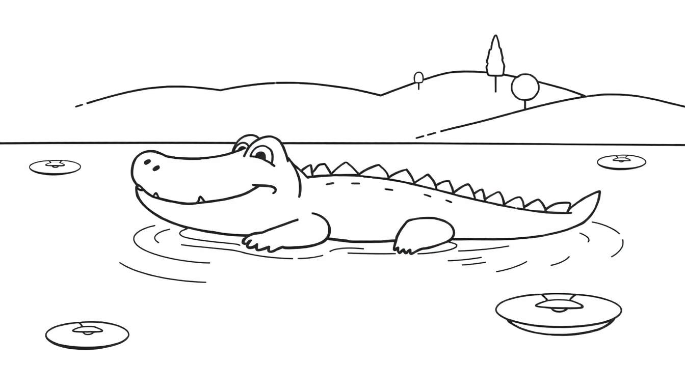 Een vrolijke, zwart-wit lijntekening van een glimlachende krokodil in het water, omringd door een rustig achtergrondlandschap met glooiende heuvels, drie bomen en drijvende schijven. Perfect om in te kleuren!