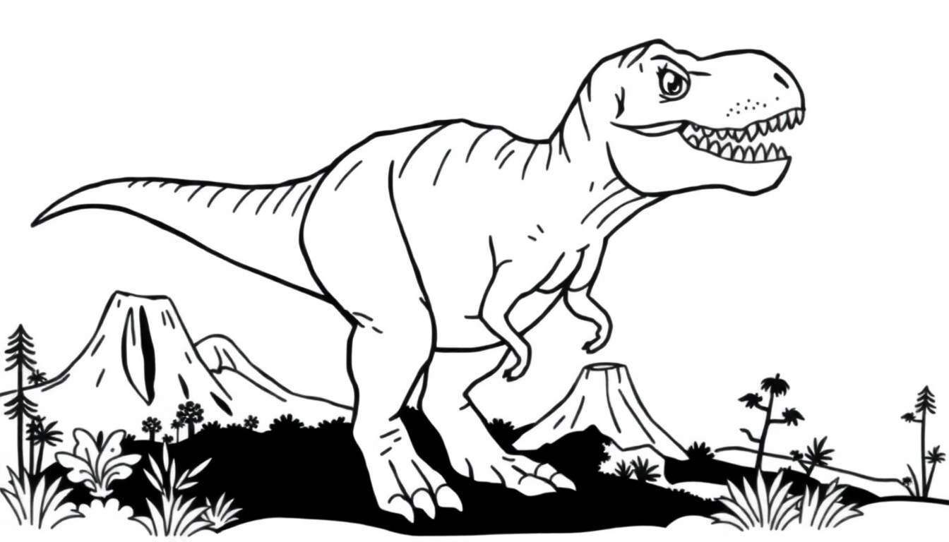 Gratis downloadbare zwart-wit kleurplaat met een lachende Tyrannosaurus Rex in een prehistorisch landschap met bergen, vulkanen en weelderige vegetatie. Perfect voor kinderen die van dinosaurussen houden!