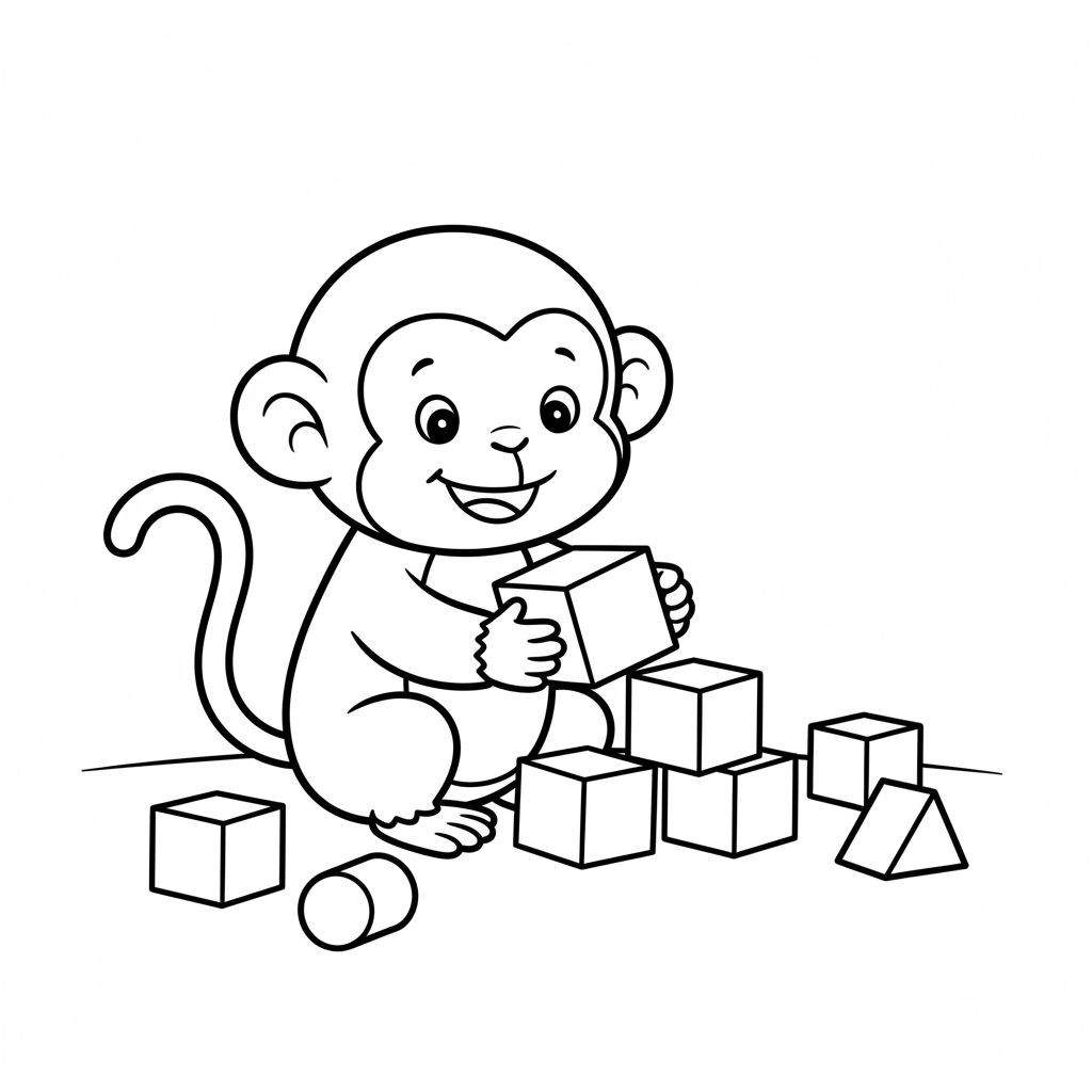 Ontdek een schattige en vrolijke kleurplaat van een lachend aapje dat geconcentreerd op de grond zit en speelt met diverse bouwblokken. Het aapje houdt speels één blok vast, terwijl om hem heen kubussen, een cilinder en een driehoekig blok liggen te wachten om gekleurd te worden. Deze eenvoudige zwart-witte lijntekening is perfect voor jonge kinderen en stimuleert creativiteit en fijne motoriek.