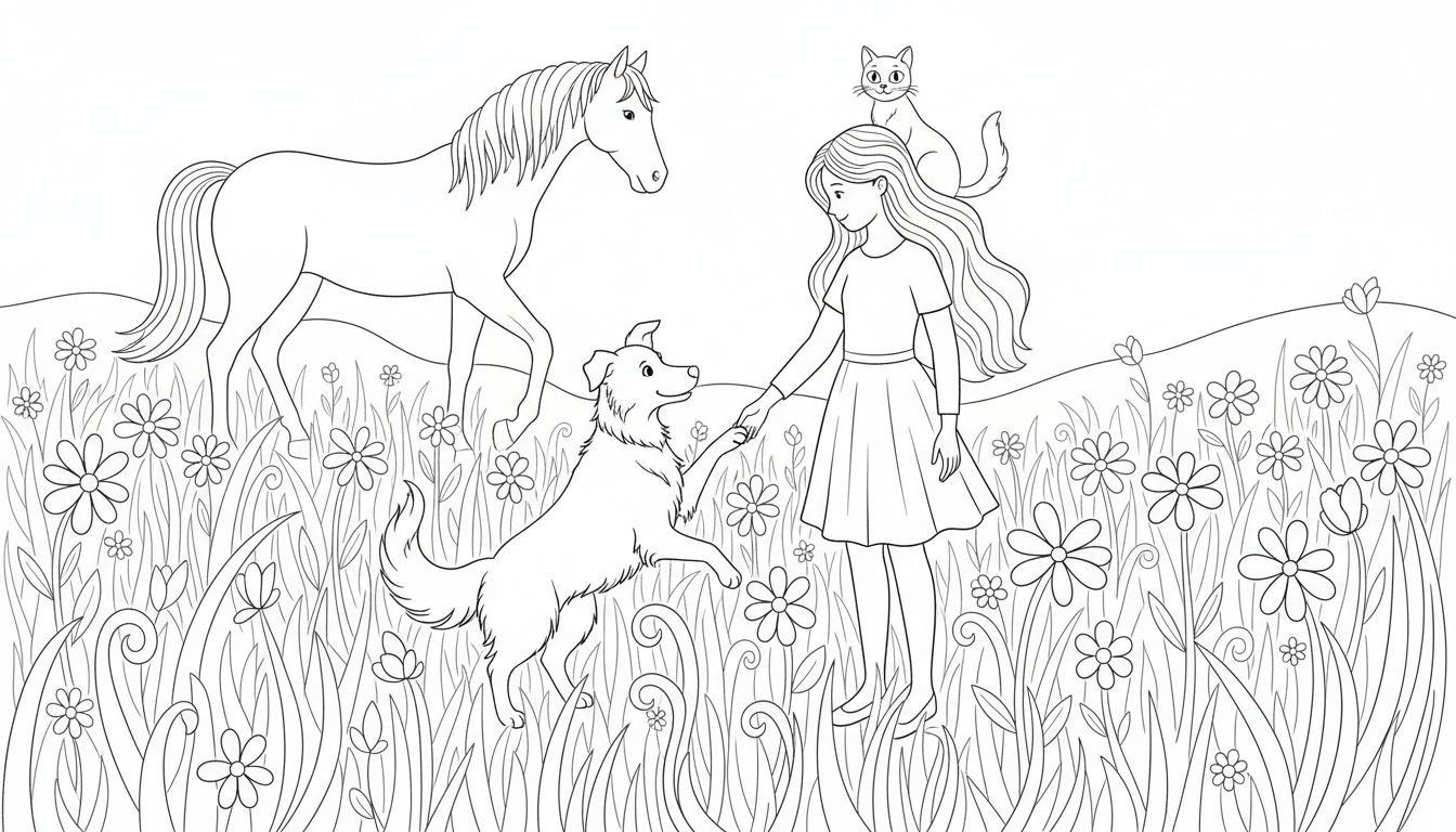 Een gedetailleerde zwart-wit lijntekening van een meisje in een bloemenveld, samen met een hond, een kat op haar hoofd en een paard. Perfect om in te kleuren en de vrolijke sfeer tot leven te brengen.